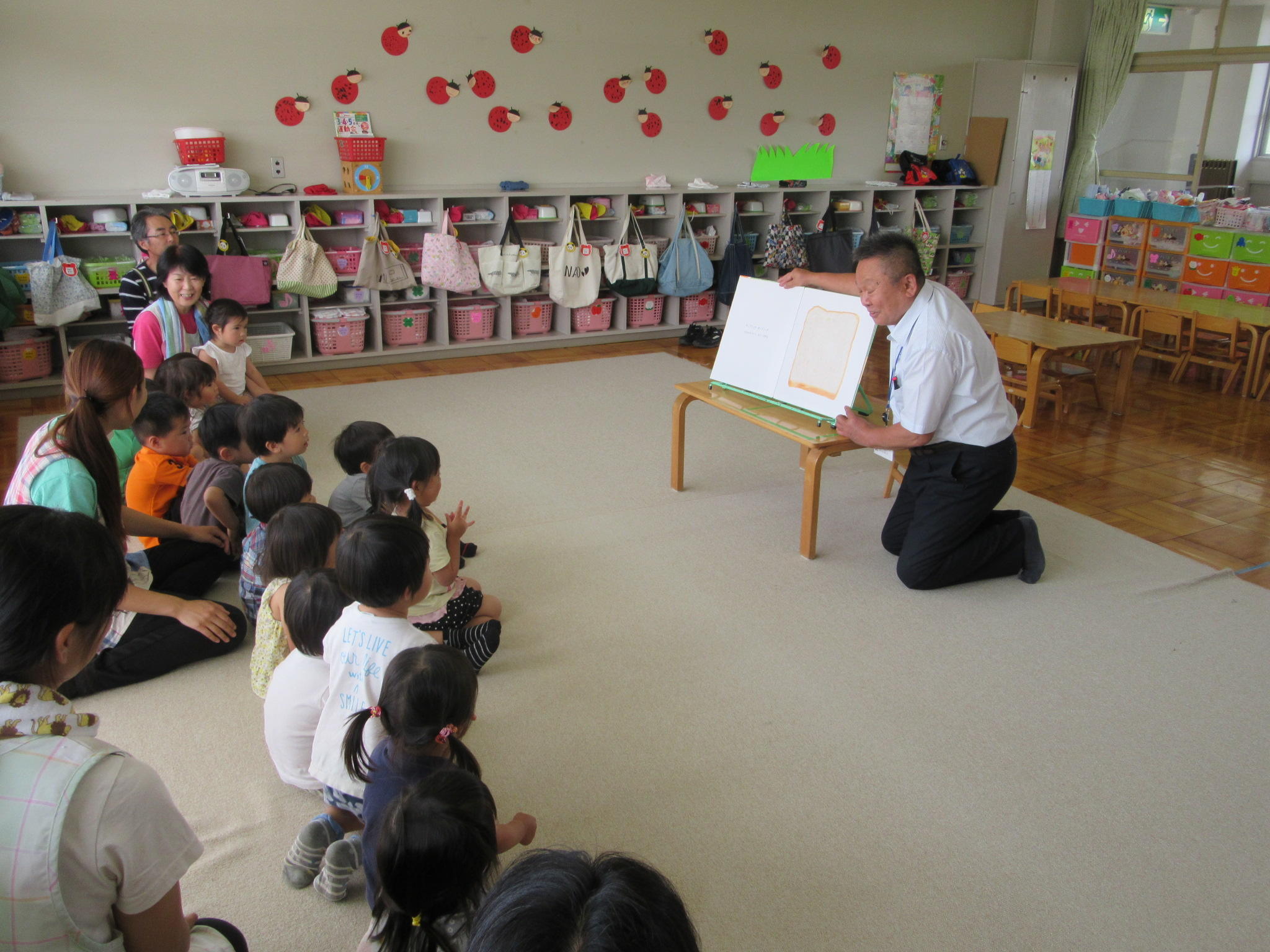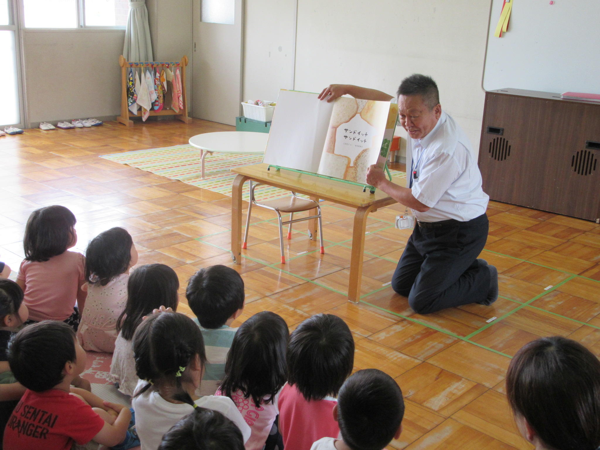 5月の出前読み聞かせに行ってきました。 5月25日に第一保育所に出前読み聞かせに行ってきました。 【第一保育所】 『サンドイッチサンドイッチ』 みんなで「いただきます」と言って サンドイッチをたべました 『どうぶつしんちょうそくてい』 絵動物の身長を聞くたびに驚いていました