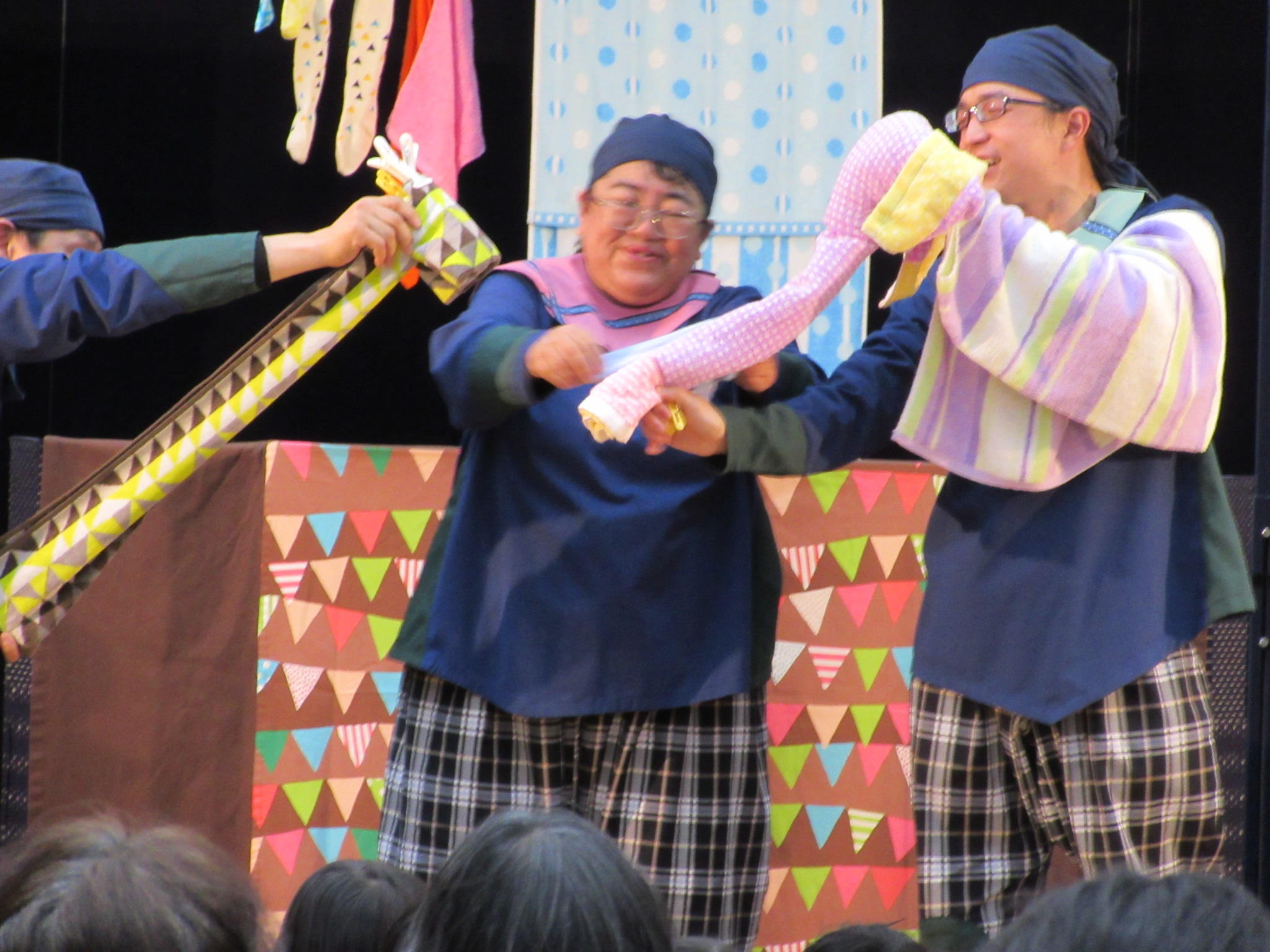 人形劇を公演しました 第1幕「あそんジャOH!」てぶくろやハンカチなど ふだんみのまわりにあるものが かたつむりやペンギンに大ヘンシン つぎはなににへんしんするのか みんなであててたのしみました 第2幕「こぶじっさ」 ほっぺにおおきなこぶのあるじっさが 神さんたちのえんかいにでくわしました 「おどりがうまかったらかえしてやる」といわれたじっさは うまくおどれたのかな? ♪ ほんとうにたくさんのご来場、ありがとうございました。 ♪
